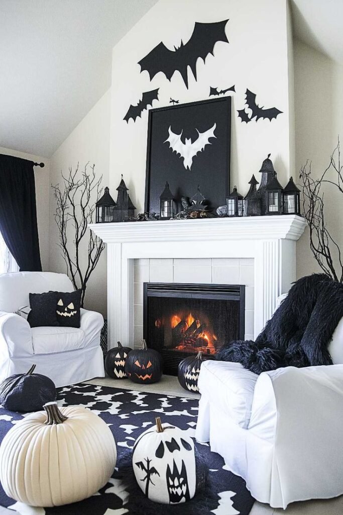 9. Black & White Halloween Mantel