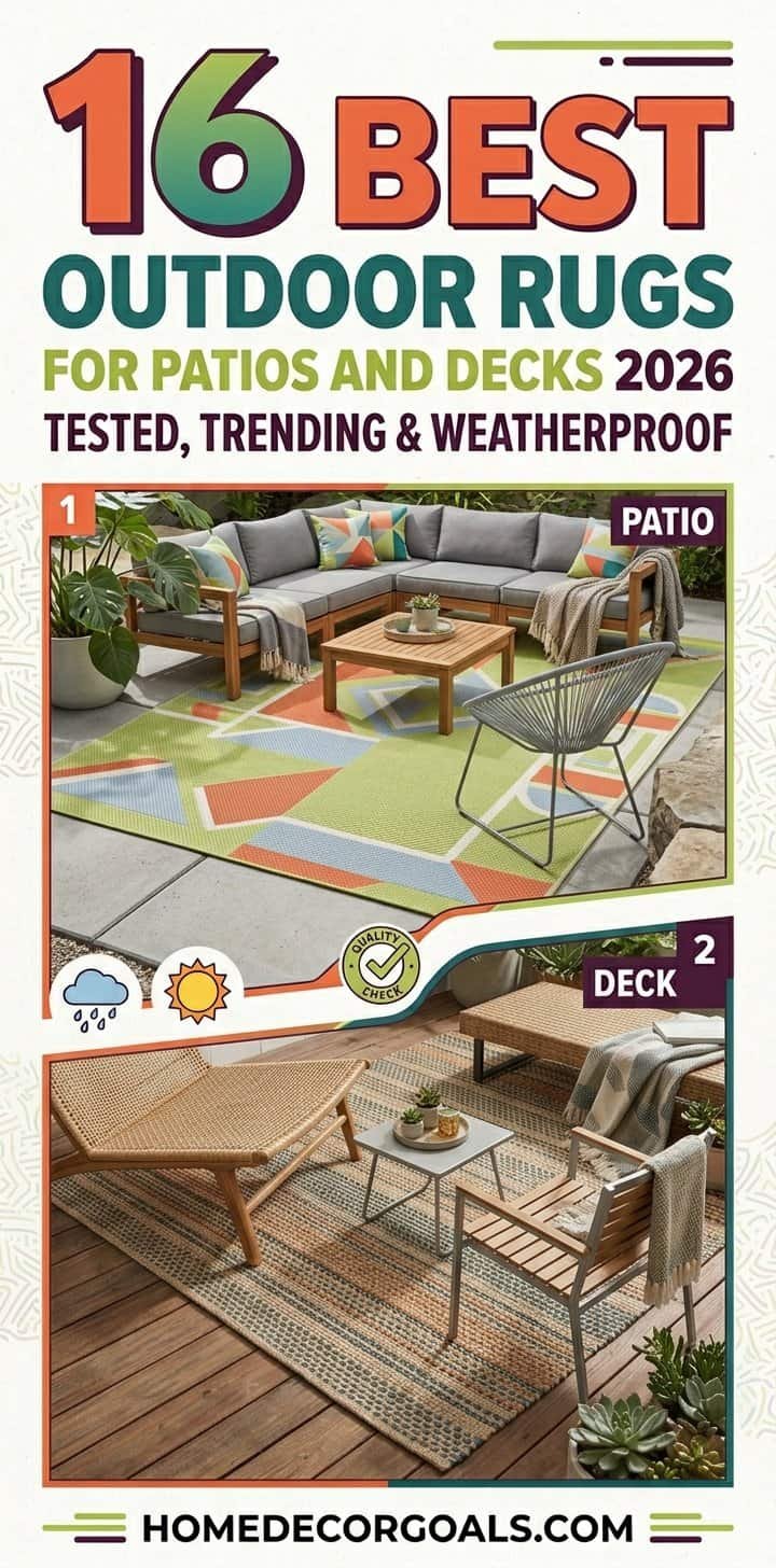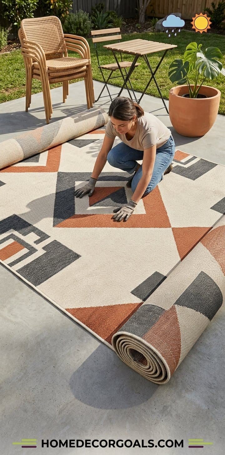 Every interior designer will tell you the same thing: a room starts with the rug. This is equally true outdoors. An outdoor rug placed on your patio or deck surface draws an invisible boundary that says “this is the living room” — separating the seating area from the grill area, the walkway, and the general open space. Without a rug, outdoor furniture looks like it was placed randomly on a slab of concrete. With a rug, the same furniture looks arranged, intentional, and unified.The rug size should be large enough that the front legs of your primary seating sit on it. For a typical outdoor living room with a sofa, two chairs, and a coffee table, a 5×7 or 6×9 rug provides adequate coverage. Measure your seating arrangement first — lay out the furniture where you want it, then measure the footprint and buy a rug that covers at least 80 percent of that area.For budget buying, check Walmart, Target, and Amazon for outdoor polypropylene rugs in the $25 to $60 range. The Safavieh Courtyard collection and the Nuloom indoor/outdoor line consistently deliver the best style-per-dollar in this price range. Choose a pattern and color that anchor your entire outdoor color scheme — every other design decision you make (cushion colors, throw blanket, planter choice) should reference back to the rug’s palette.Flatweave construction is mandatory for outdoor use. High-pile rugs trap water, grow mold, and deteriorate within one season. Flatweave rugs drain quickly, dry within hours, and survive three to five years of regular outdoor use. Shake the rug out weekly to remove debris and hose it down monthly for deep cleaning.