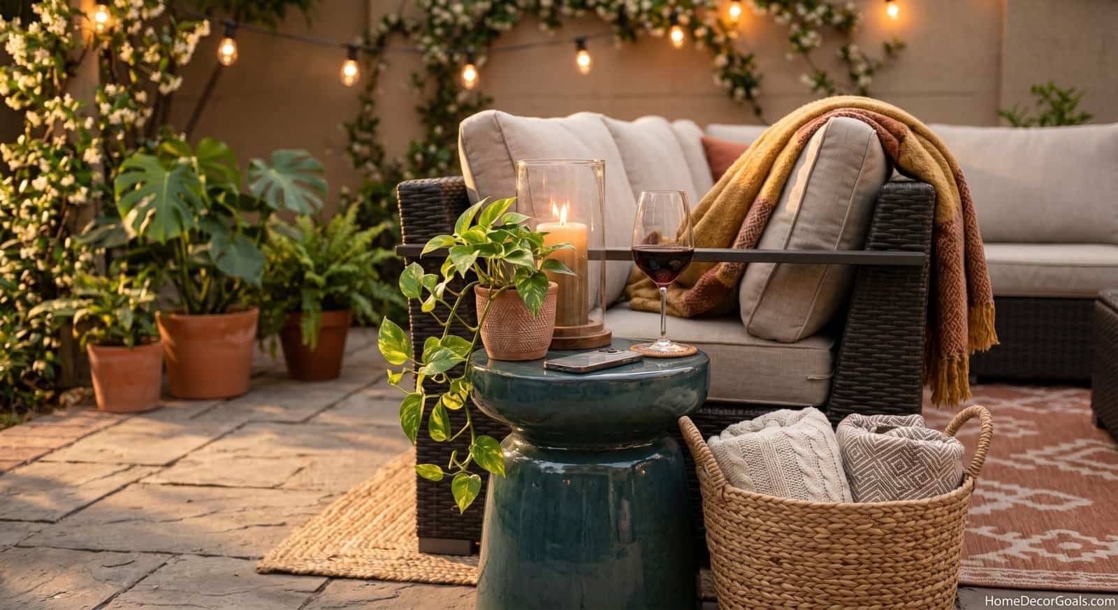 Every outdoor living room needs at least one small side table positioned within arm’s reach of the primary seating spot — because the coffee table is often too far away to set down a drink without standing up. The side table is where your glass of wine actually lives while you are lounging, where your phone charges, where the Bluetooth speaker sits, and where the candle that makes the evening glow rests.