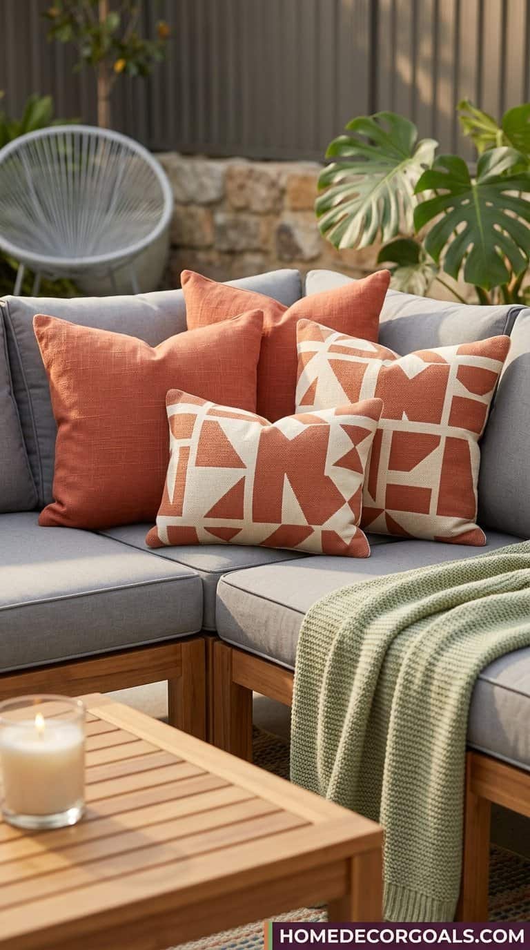 Throw pillows are the fastest, cheapest way to inject color, pattern, and personality into your outdoor living room. They are also the element that most clearly signals “someone designed this space” versus “someone bought furniture and stopped.” A sofa without throw pillows looks institutional. The same sofa with four to six coordinating throw pillows looks styled, inviting, and personal.The formula for outdoor throw pillow arrangement is the same as indoor: pick two to three colors from your rug’s palette, buy pillows in those colors with a mix of solid, patterned, and textured covers, and arrange them asymmetrically on the sofa. For a standard outdoor sofa, four pillows is the sweet spot — two large (18-inch) in a solid color and two medium (16-inch) in a complementary pattern. For a sectional, add two more for the chaise or end section.Buy outdoor-rated pillow covers rather than complete pillows — the covers are cheaper ($5 to $10 each on Amazon), easier to wash, and the inserts can be reused with different covers when you want to change the look seasonally. A single set of four outdoor pillow covers costs $15 to $25 and ships in two days. Swap to warm autumn tones in September, festive colors in December, and fresh pastels in March for a living room that evolves with the year.Add one throw blanket draped over the sofa arm or the back of a chair. Even in summer, evenings cool down enough that a lightweight throw becomes welcome — and during the day, the blanket serves as a design element that adds a layer of texture and warmth to the visual composition. An outdoor throw ($10 to $20 from Target or TJ Maxx) in a coordinating color completes the textile layer that makes your outdoor room feel as intentionally decorated as your indoor one.