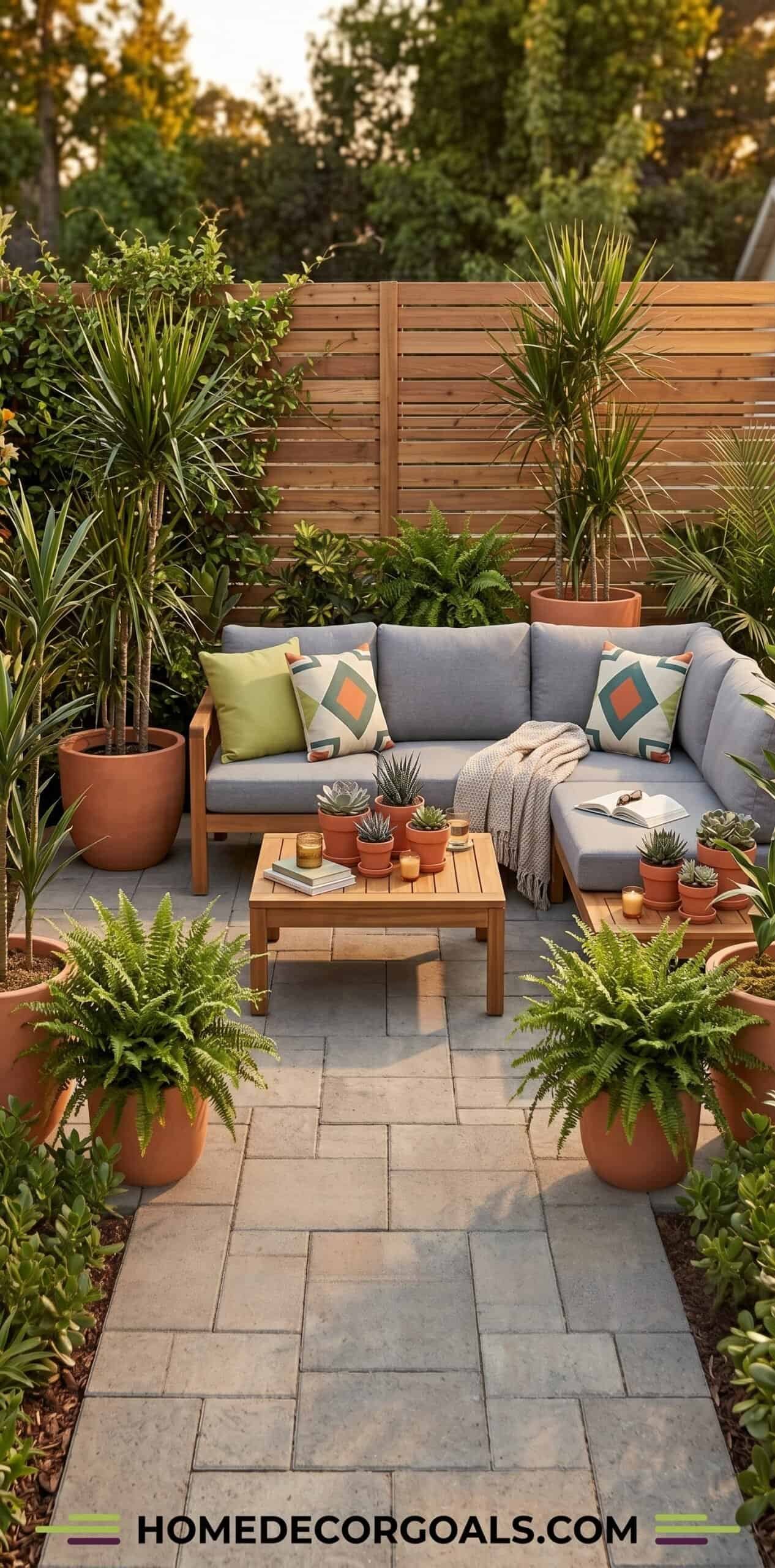 The Perimeter Strategy: Place four to six potted plants at the edges of your seating area — along the fence behind the sofa, in the corners, and flanking the entrance. Use a mix of heights: one or two tall plants (four to five feet, like a dracaena, fiddle leaf fig, or tall grass) for vertical drama, two to three medium plants (two to three feet, like ferns, hostas, or flowering bushes) for middle fill, and two to three small plants (one foot, like succulents, herbs, or small flowers) at ground level for detail.