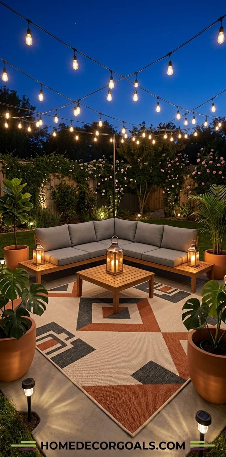 Layer One — Overhead String Lights ($8-$15): Run a strand of warm-white string lights across the space at a height of eight to ten feet. Attach them to the house, fence posts, trees, or tall poles (even an inexpensive shepherd’s hook garden stake works as a light pole). The lights create a “ceiling” over your outdoor room that defines the space vertically the same way the rug defines it horizontally. Your outdoor room now has a floor (the rug) and a ceiling (the lights) — two of the four elements that make a space feel like a room.