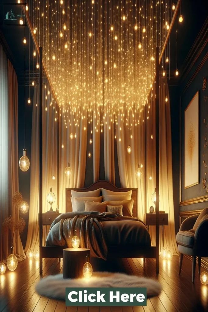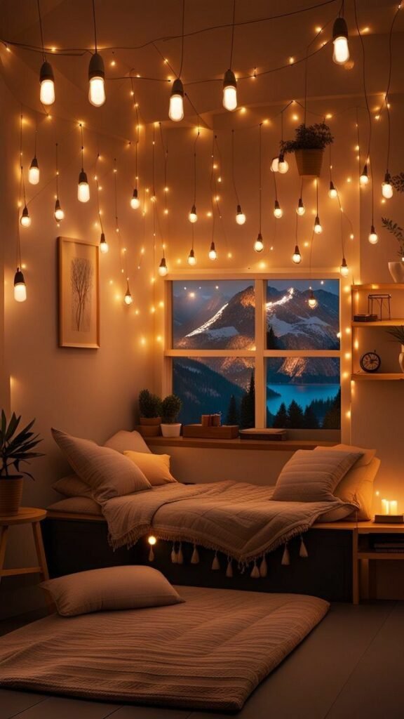 Drape soft yellow or amber-toned string lights around your headboard, curtain rod, or shelves. They create a subtle glow that mimics candlelight but with zero fire hazard. If your lights are dimmable, even better.