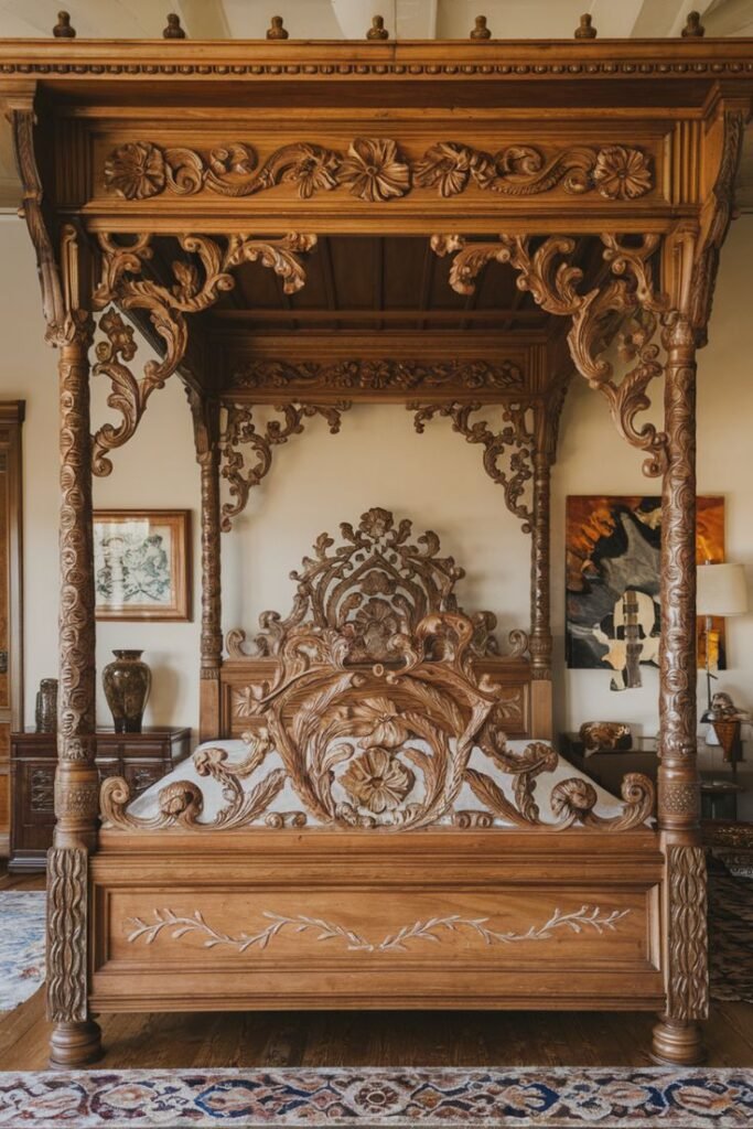 An antique or vintage-style wooden bed frame sets the tone for the entire space. Go for curved headboards, spindle posts, or distressed wood in walnut, oak, or chestnut finishes. These pieces ground your room and instantly bring a sense of age and history.