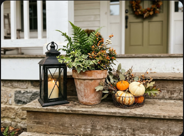 Porch steps are prime decorating real estate that most people ignore completely. A small arrangement on the steps — called a vignette — adds instant charm and makes the entrance feel styled.