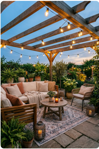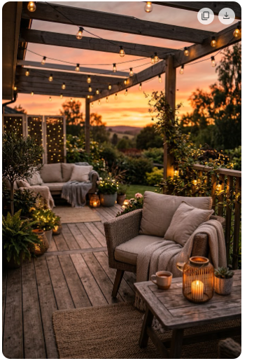 [IMAGE 5: Patio with string lights hung overhead creating warm ambient glow. Evening scene with seating below. Dreamy, aspirational. Size: 800x600px + 1000x1500px Pinterest pin]