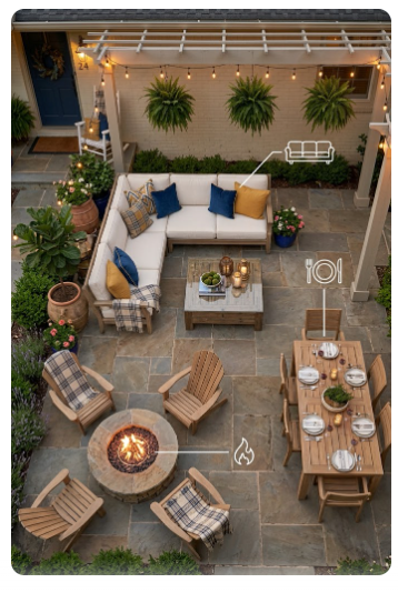 The most functional patios aren’t designed around a single use — they’re divided into zones that serve different purposes throughout the day.