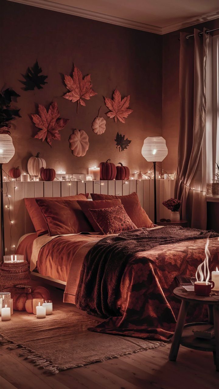 Introduce warm, ambient lighting using string lights, fairy lights, or lantern-style table lamps. Battery-powered candles or real soy candles in pumpkin spice, vanilla chai, or cedarwood scents also create a flickering, intimate atmosphere.
