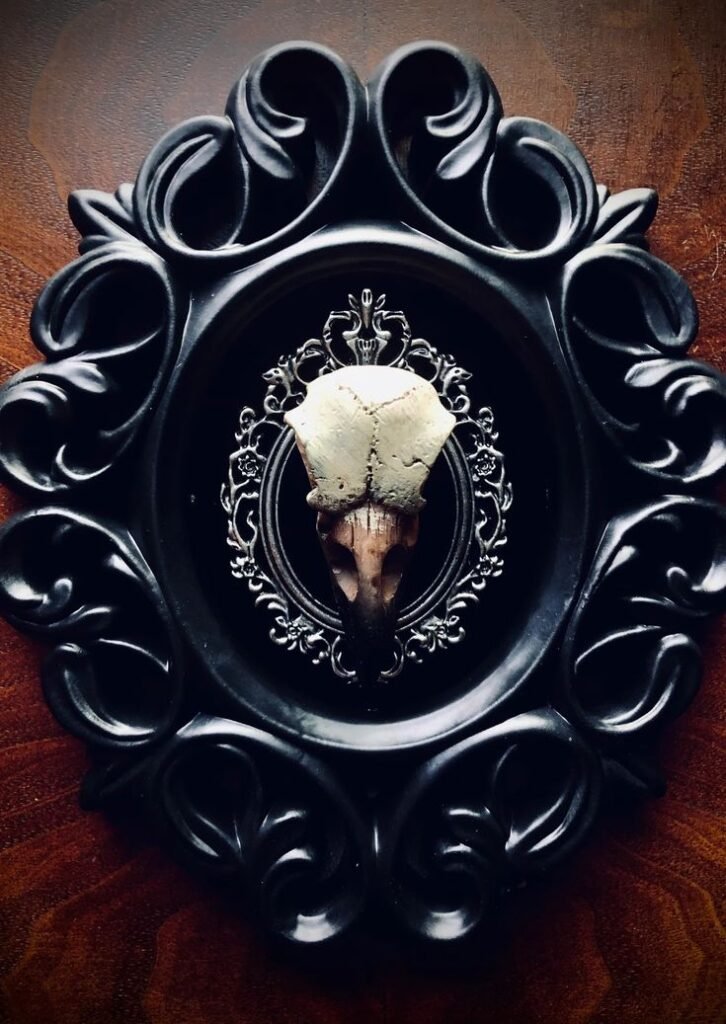 Think eerie beauty. Take a deep photo frame and layer it with vintage lace as the background. Add faux moths, beetles, or butterflies pinned inside. It’s elegant and creepy all at once.