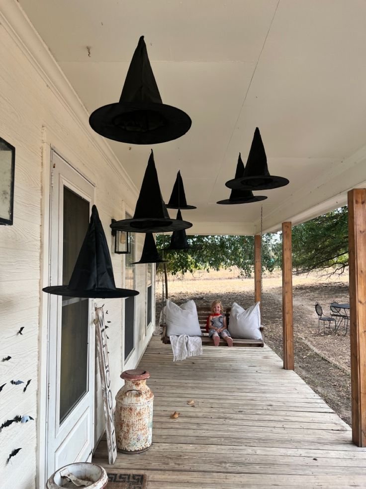 Hang a black witch hat—matte or velvet—from a corner via invisible fish line. Let it float above benches or planters. Occasionally shift its height for animation in breezy weather.