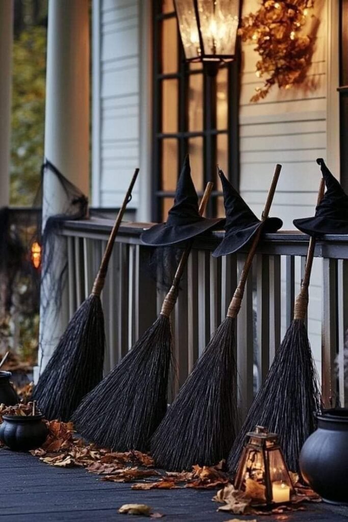Lean a decorative witch’s broom or oversized lantern by the entry door. Add a few sprigs of dried leaves or black ribbon. This creates a small “character” vignette—like your porch has a story before you even arrive.