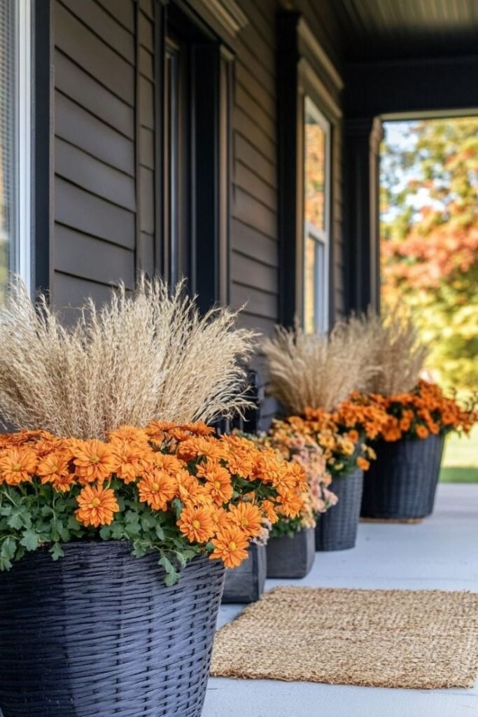 Plant orange or deep burgundy mums in black metal or copper pots. Place at corners or lining railings for symmetry. Their blooms hold strong even in damp weather.