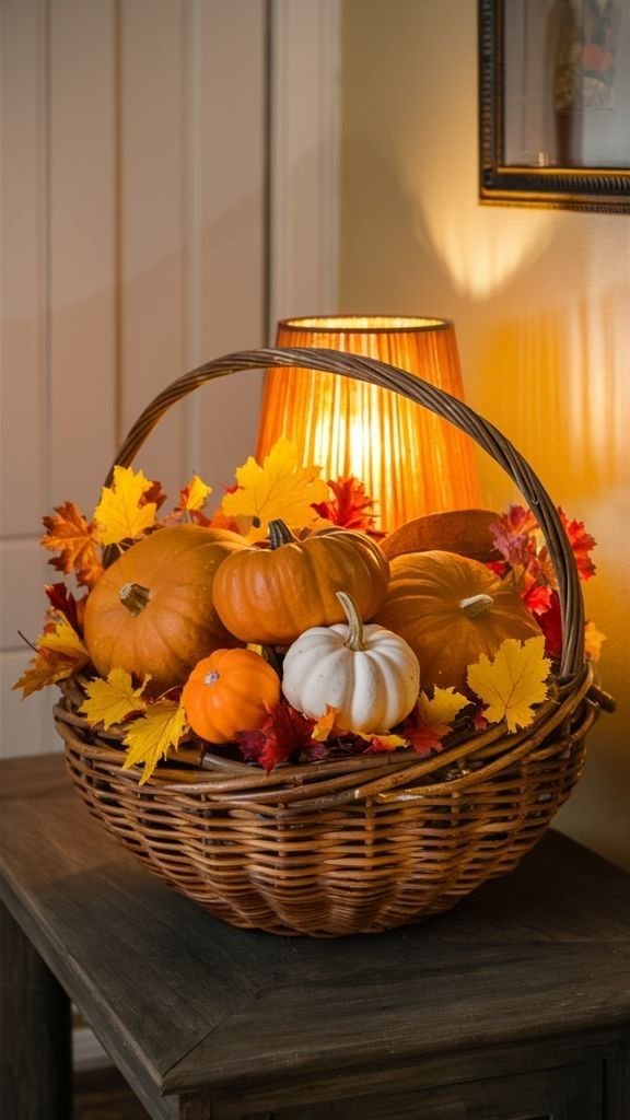 Fill a woven basket or crate with mini gourds, small pumpkins, or dried cornstalks. Place it beside seating or near railings. Add a few cinnamon sticks or dried leaves for depth.