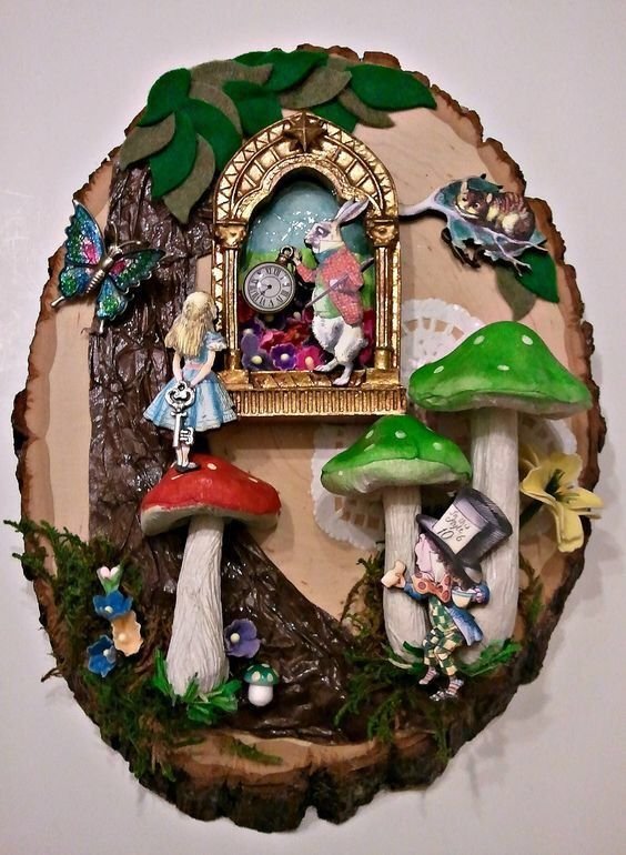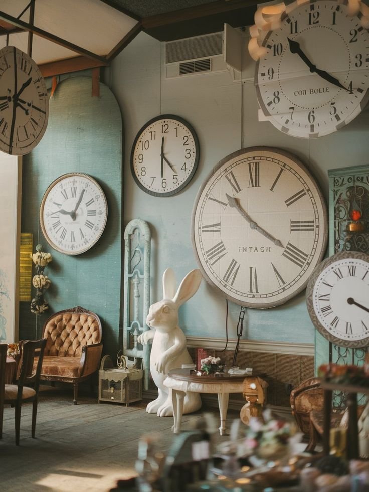 Hang 3–4 small mismatched clocks set to random times. Arrange them artfully to mimic the disarray of Wonderland’s “always tea time” world. Use different frame styles to add to the eclectic effect.