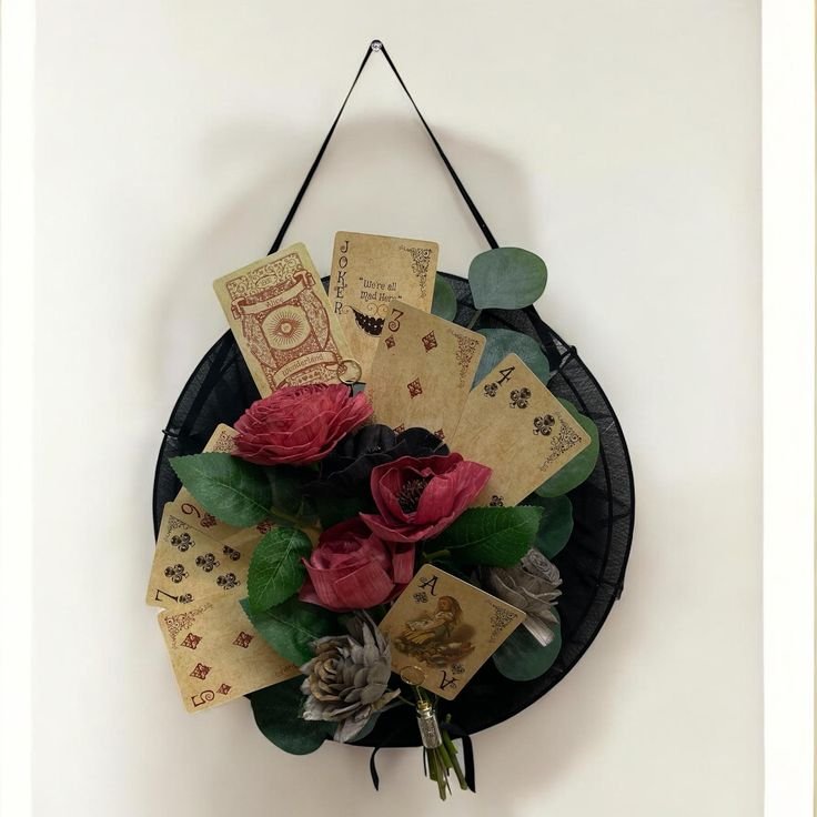 Create a simple garland by stringing playing cards together with twine. Drape it across your mirror, bedframe, or above a small workspace. Choose heart cards only for a Queen of Hearts moment, or go full deck for chaos and charm.