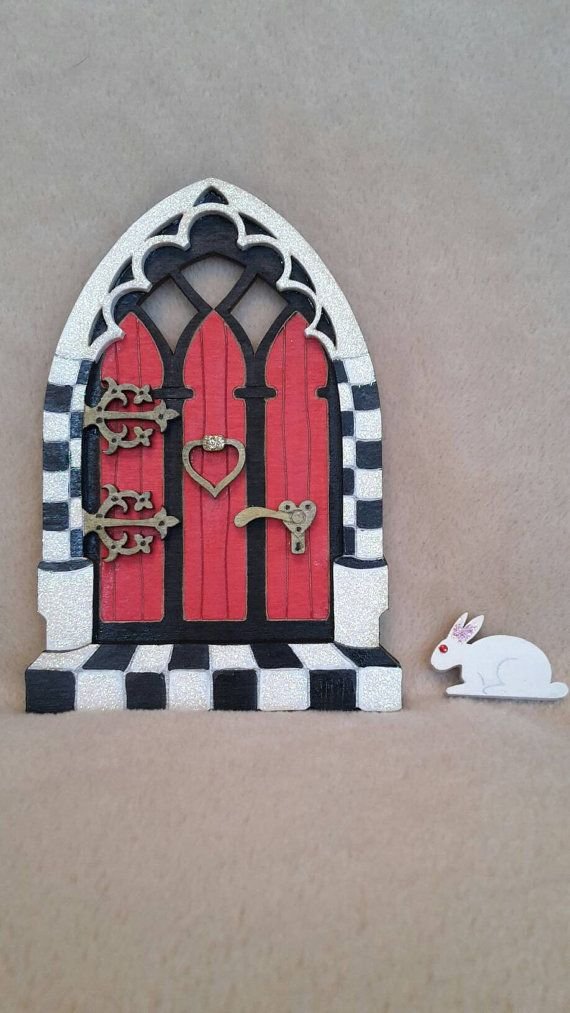 Create a tiny “mystery door” using cardboard, craft wood, or a dollhouse door and paint it brightly—think lavender, teal, or classic red. Attach it low on your wall or along your bookshelf baseboard.