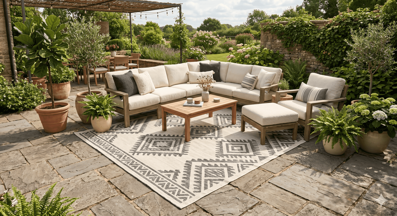 First, it defines your space. A patio without a rug is just a surface. A patio with a rug has a living room, or a dining room, or a lounge area — because the rug draws a visual boundary that your brain interprets as a room. This is the same principle interior designers use in open-plan homes to separate the living area from the dining area. It works outdoors too.