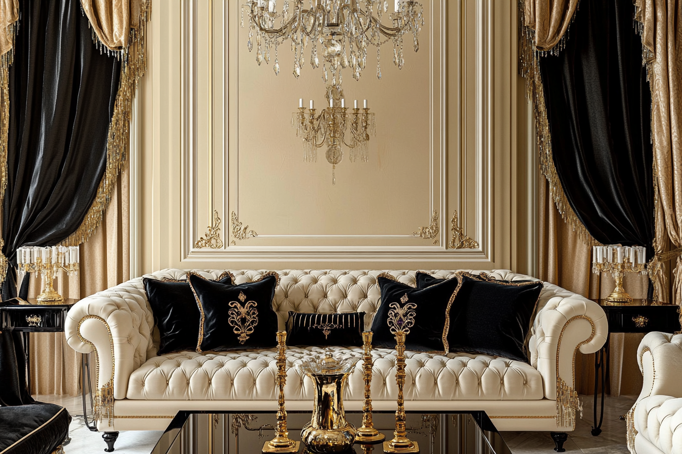 Use luxurious materials like silk and velvet to introduce a touch of luxury. A silk beige drapery and velvet black pillows add depth and indulgence to your living space.