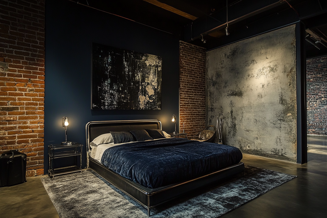 A dark blue and silver bedroom with industrial elements brings a bold and modern aesthetic. A deep blue accent wall adds depth, while exposed brick or concrete textures enhance the industrial vibe.