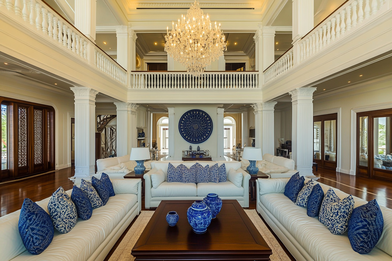 Lighting plays a key role in setting the mood of the room. A statement chandelier, pendant lights, or blue-tinted lampshades can enhance the blue and white aesthetic.