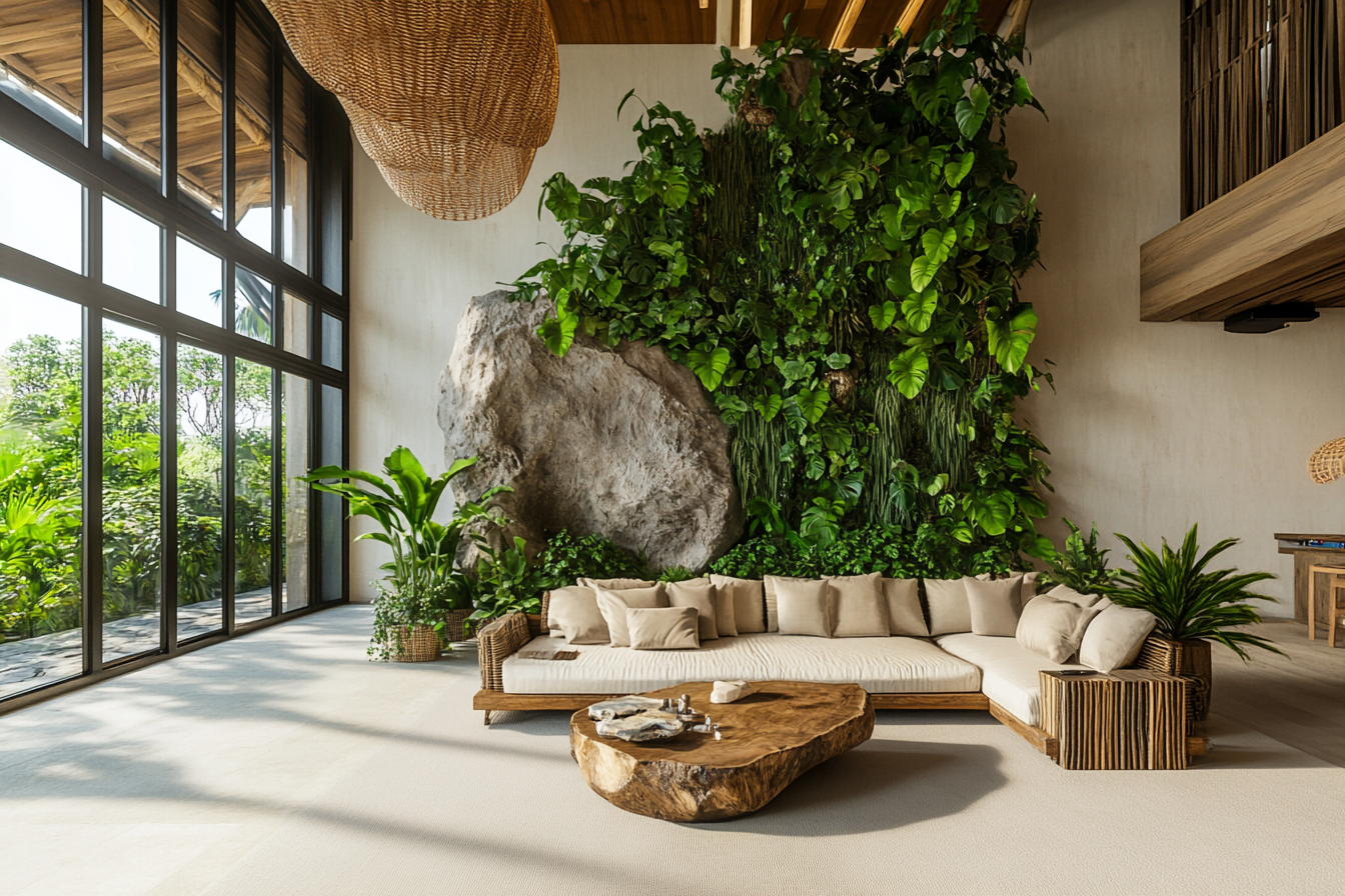 Natural materials complement the greenery and add warmth. Incorporate wooden furniture, stone sculptures, and woven baskets to create a seamless indoor-outdoor connection. The result is a space that feels alive, calming, and effortlessly stylish.