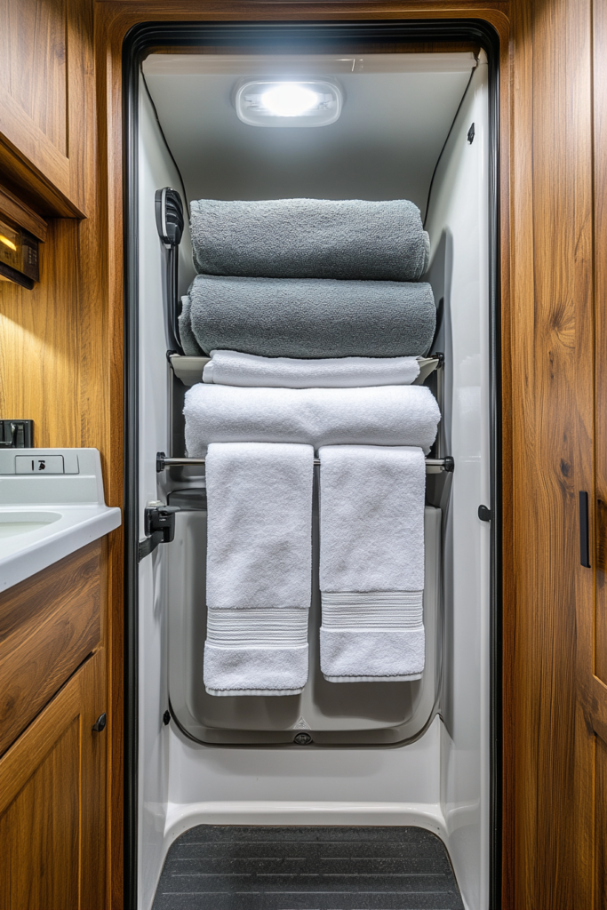 This simple solution helps in maintaining order and accessibility, making the most out of limited closet space in a camper.