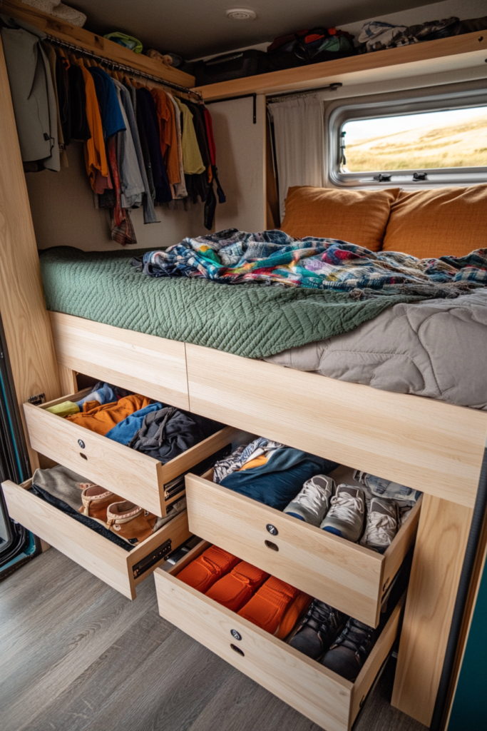 Slide-out drawers utilize the depth of your camper efficiently. These can be excellent for organizing kitchen supplies or clothing, pulling out to reveal neatly organized items.