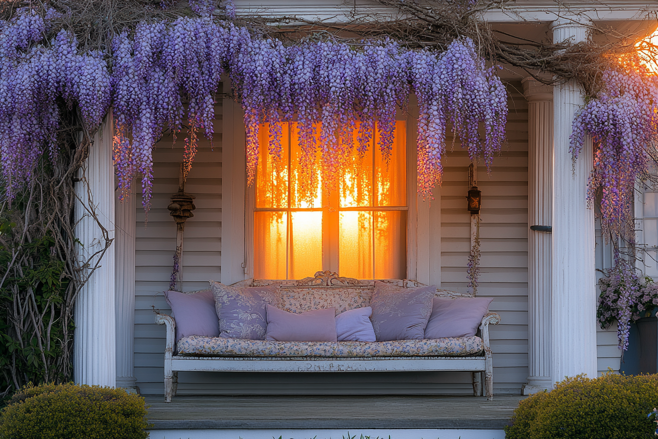 If you want your porch to feel like a fairy tale, wisteria is the way to go. These cascading purple blooms create a romantic, magical atmosphere.