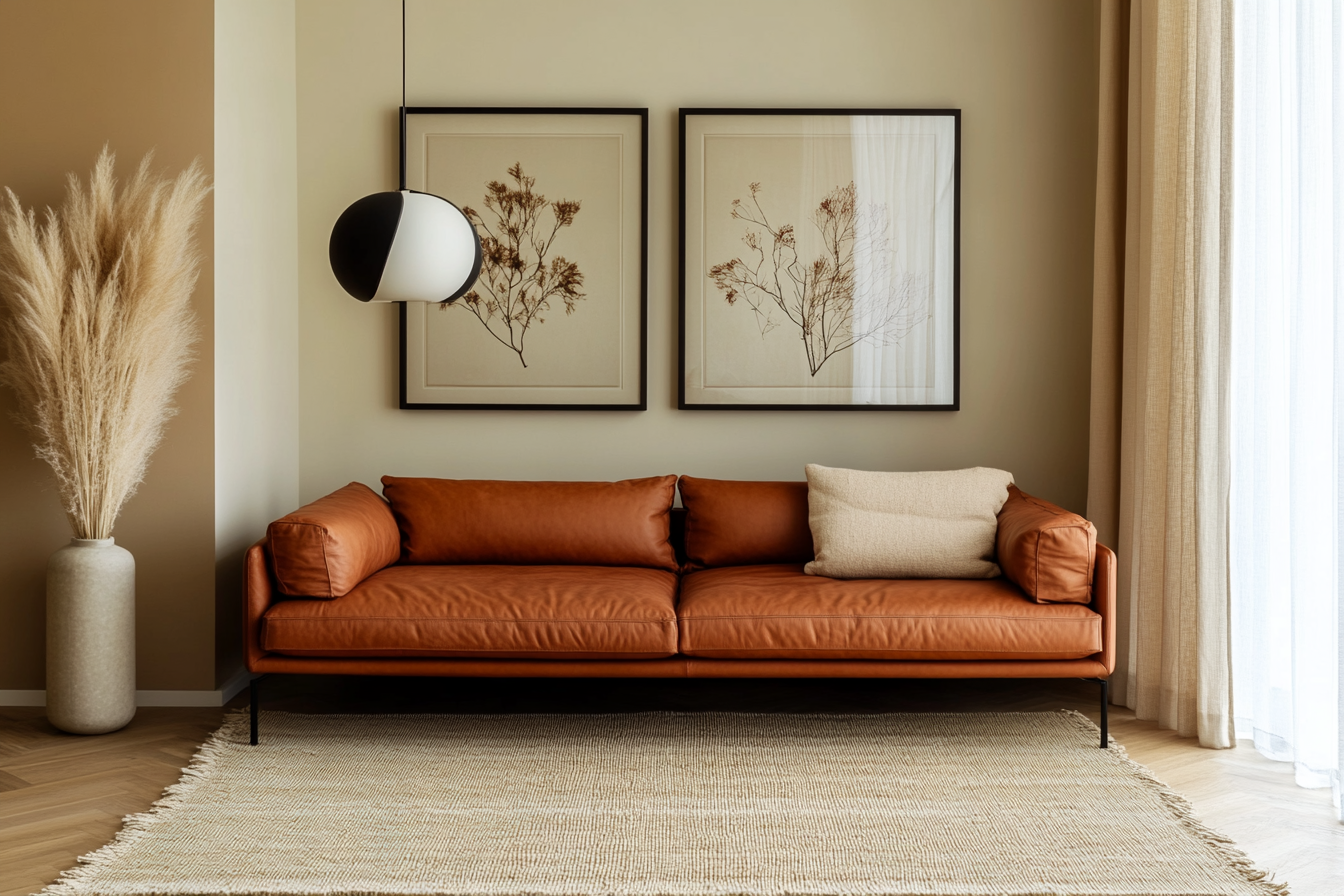 Large statement artwork in neutral tones complements the warmth of the leather. Adding smart lighting options, like LED strips or floor lamps, enhances the sleekness of the space.