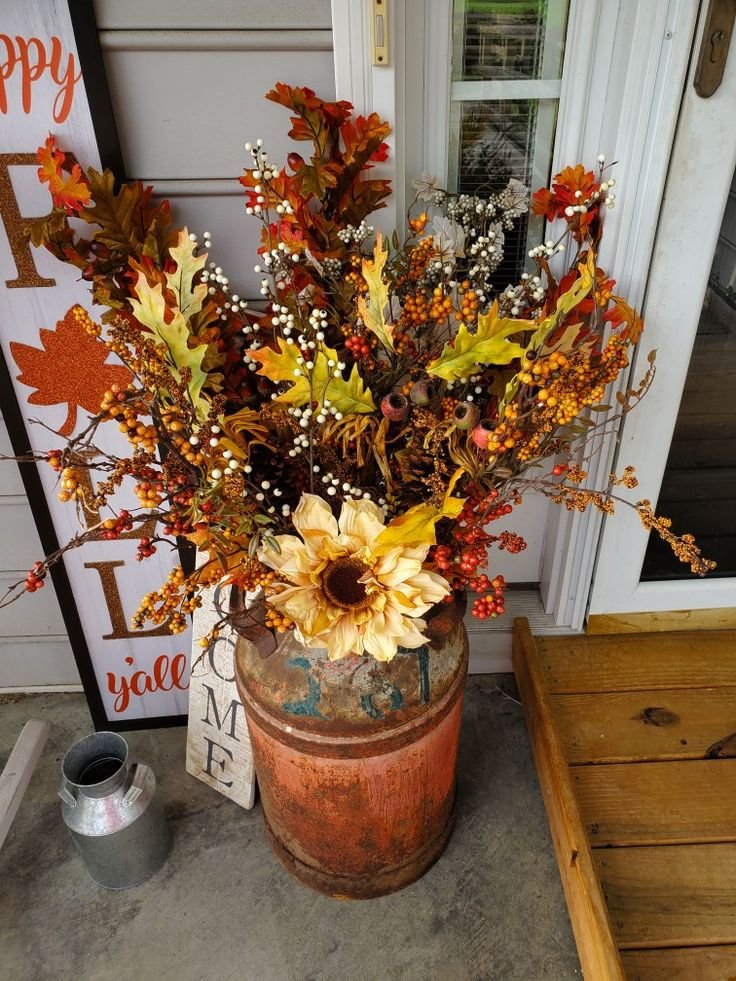 Plant mums, kale, or pansies in vintage metal buckets or terra-cotta pots. Add dried wheat, cinnamon sticks, or twigs for height. Cluster planters near the entryway for seasonal flair.
