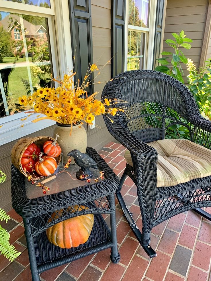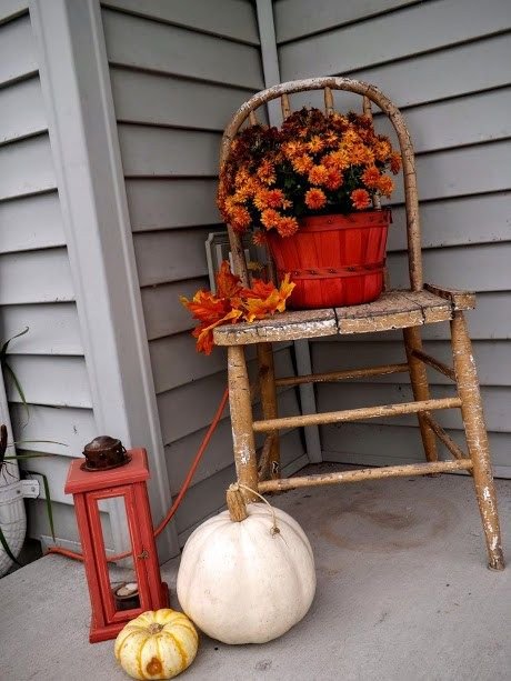 Position an antique or vintage-style chair with a folded throw. Place a mini pumpkin or fall mug on it. Nearby, add a small lantern or bouquet.