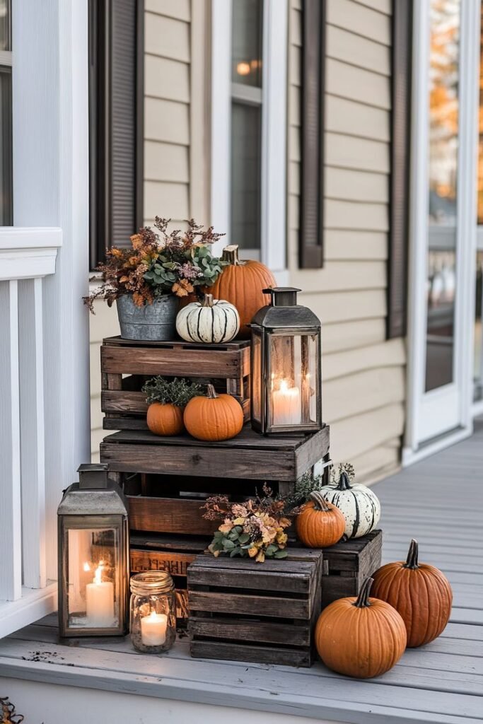 Stack two or three wooden crates to create rustic platforms for pumpkins, lanterns, or florals. Choose aged or unpainted wood for authenticity. The staggered display adds visual interest.