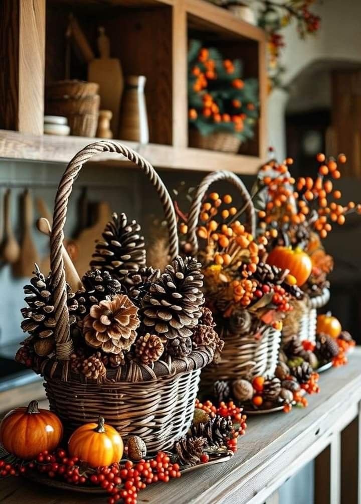 Use woven baskets filled with pinecones, faux apples, or small gourds. Set near the doorway or on a bench. The natural arrangement looks effortless and inviting.
