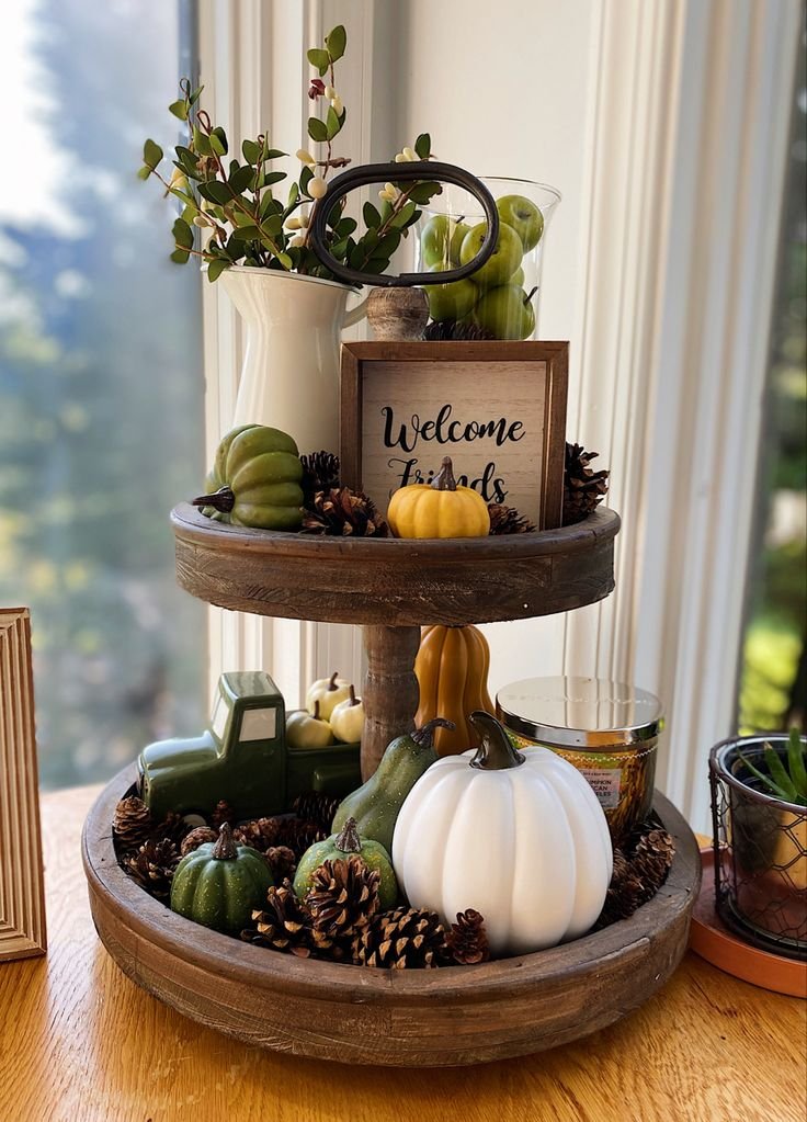 Use a tiered tray (wood or metal) on a small porch table. Layer with mini pumpkins, candles, or florals. The vertical display creates interest without bulk.