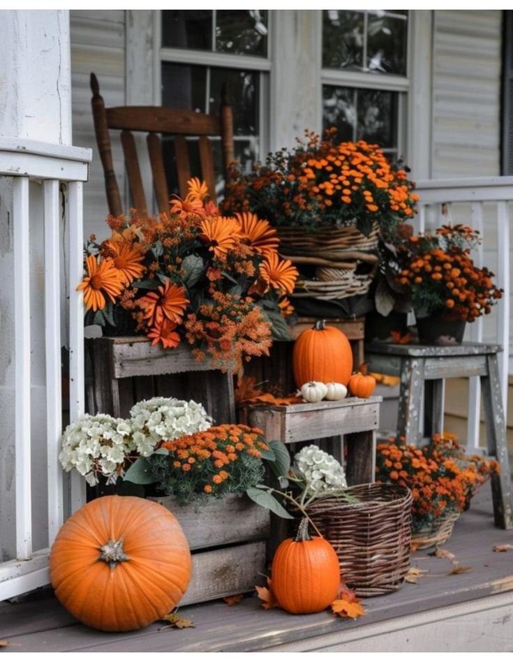 Mix real and artificial pumpkins in white, cream, green, or rust tones. Vary shapes and sizes and scatter them by the door, along steps, or on benches. Add a few gourds or hay bales for rustic charm.