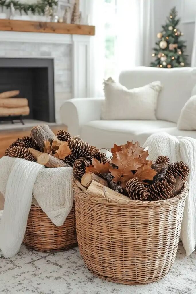 Mix in baskets of dried flowers or apples for a little extra farmhouse flair.