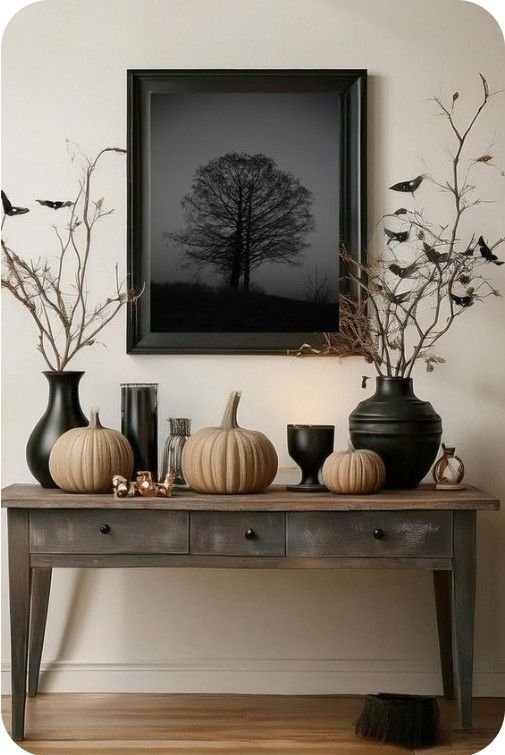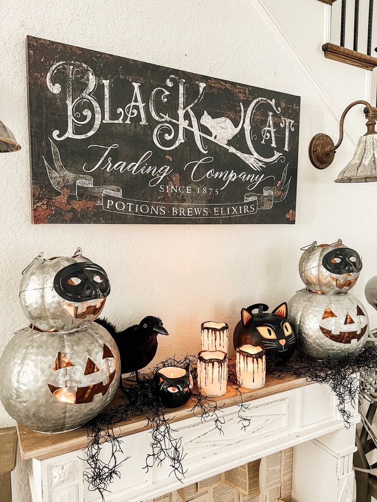 Place a gold-framed mirror behind your decor and write festive words like “October Whispers” or “Spells & Cider” with a chalk marker.