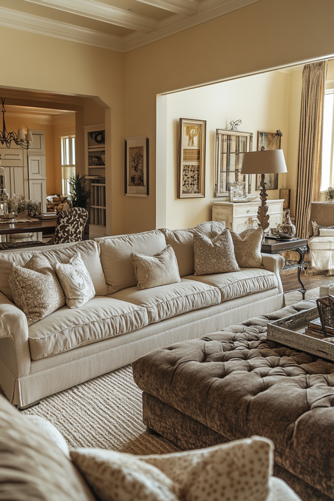 Even small details, like distressed picture frames or aged brass decor, bring a cozy, lived-in feel to the room.