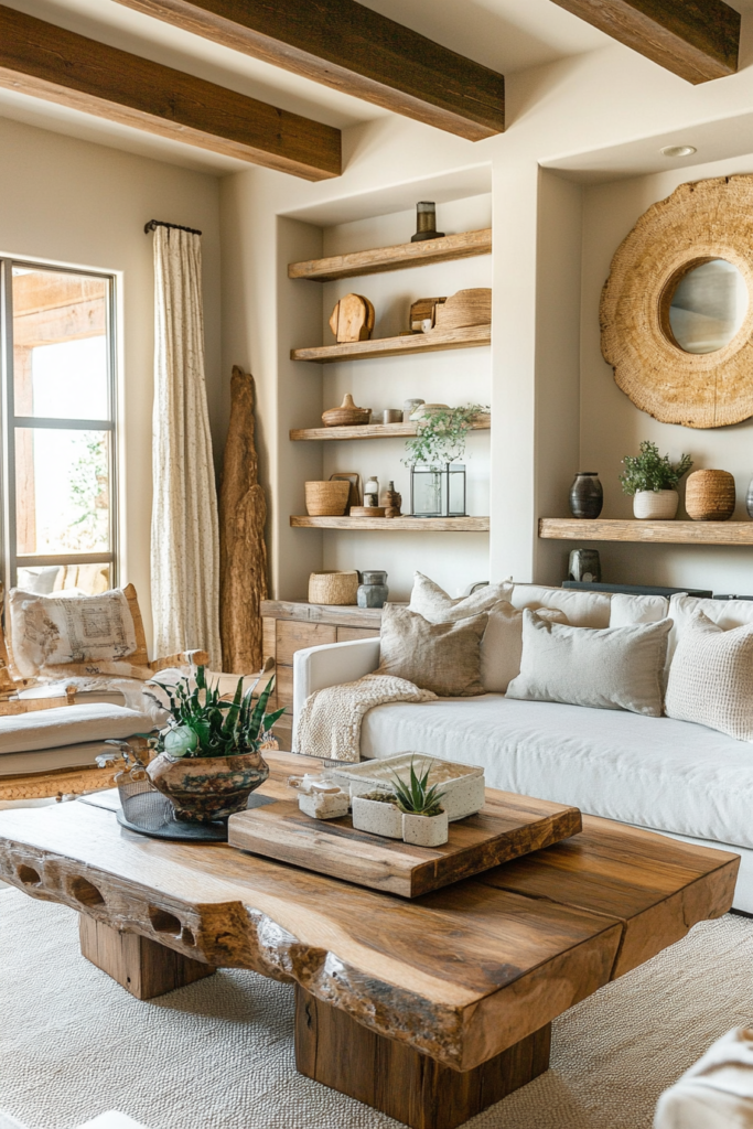 Nature-inspired elements make neutral spaces feel grounded and warm. Wooden coffee tables, shelves, and side tables bring an organic feel, while stone or ceramic vases add rustic charm.
