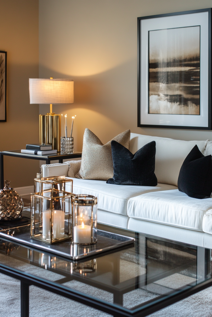 A touch of metal adds contrast and sophistication to a neutral palette. Gold or brass lamp bases create a warm glow, while black metal accents add a modern touch.