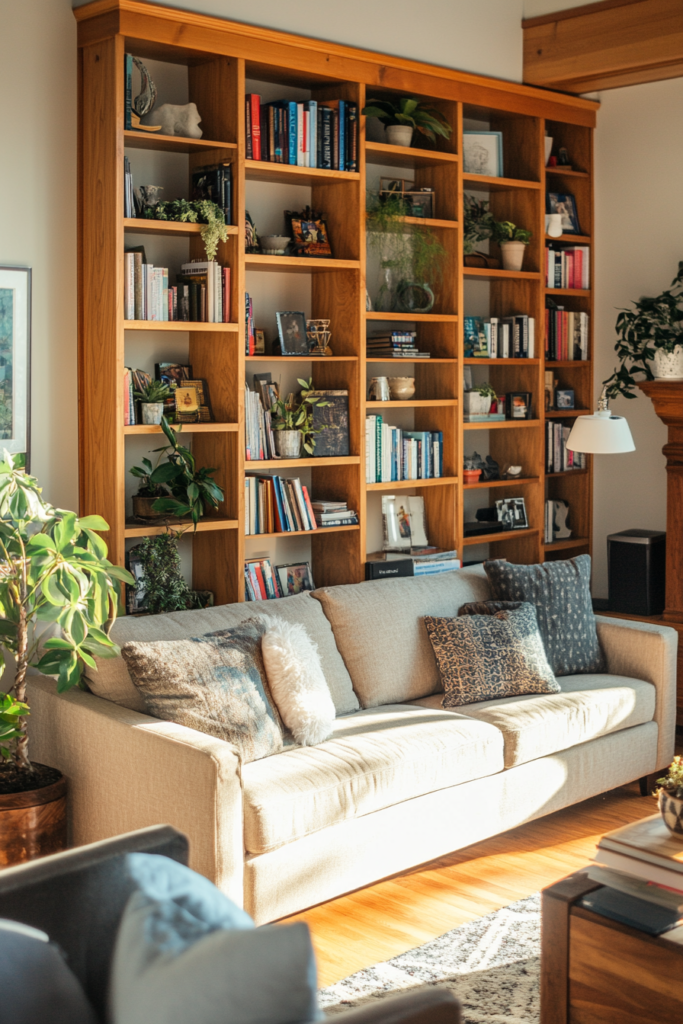 A built-in bookshelf instantly adds warmth and character to a living room. Bookshelves filled with carefully arranged books, vases, and decorative pieces create a curated, cozy look.