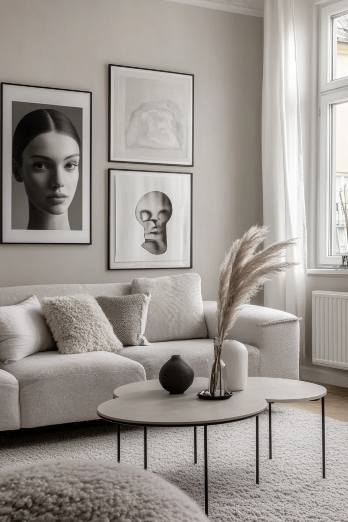 Wall art adds life to neutral spaces without overpowering them. Abstract prints in soft tones complement the aesthetic, while black-and-white photography provides a subtle contrast.