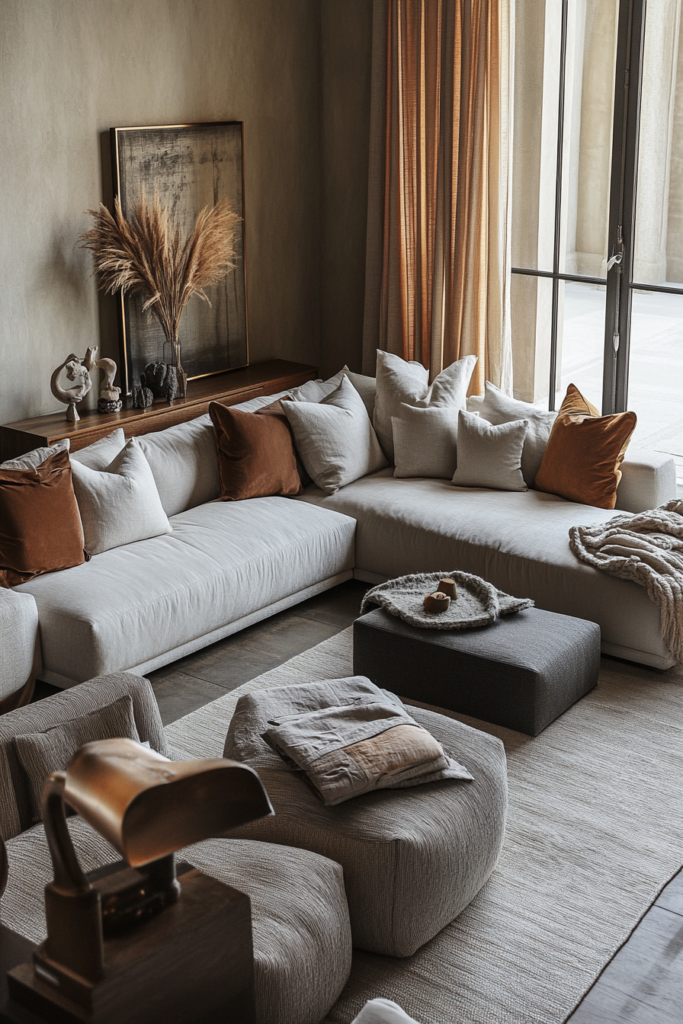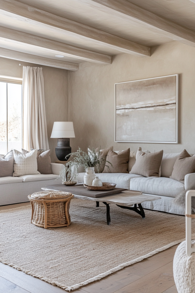 Bare windows can make a living room feel unfinished and cold. Soft, flowy curtains create a light and airy feel, while layered drapes add warmth and function. Linen or cotton curtains in soft whites or taupe work perfectly in a neutral setting.