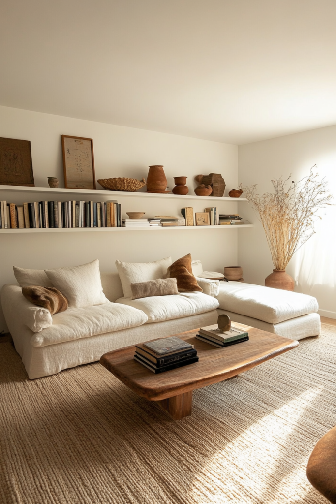 Wood is one of the easiest ways to add warmth to a neutral space. A reclaimed wood coffee table serves as a statement piece, while floating wooden shelves provide practical storage with character.
