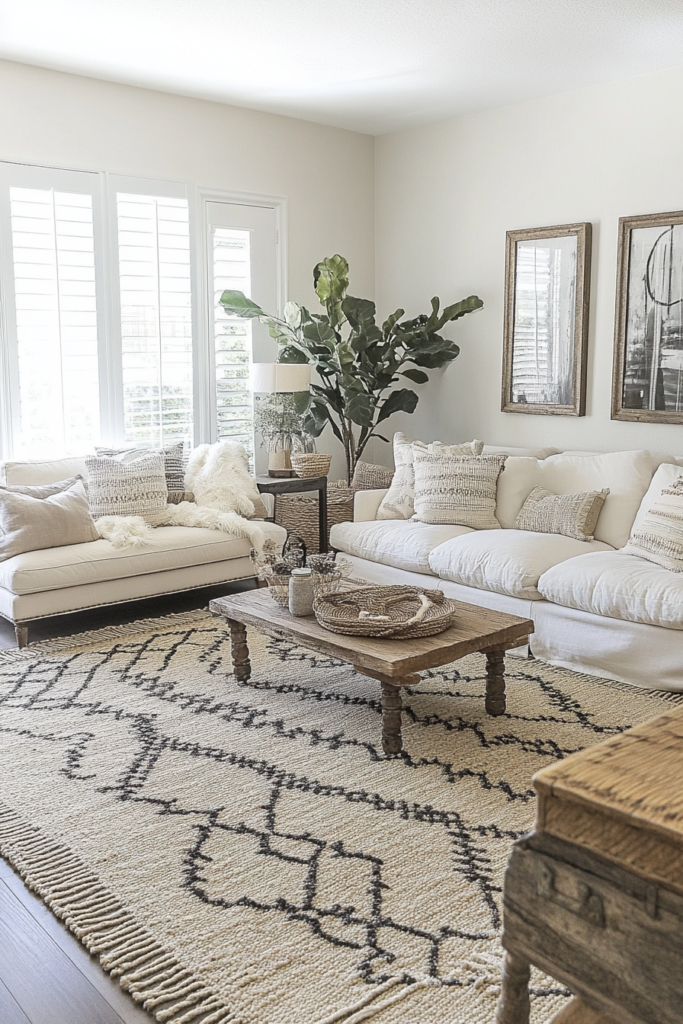 Subtle patterns in neutral shades keep things visually interesting without overpowering the room. High-pile or textured rugs add another layer of softness, making the space feel even more inviting.