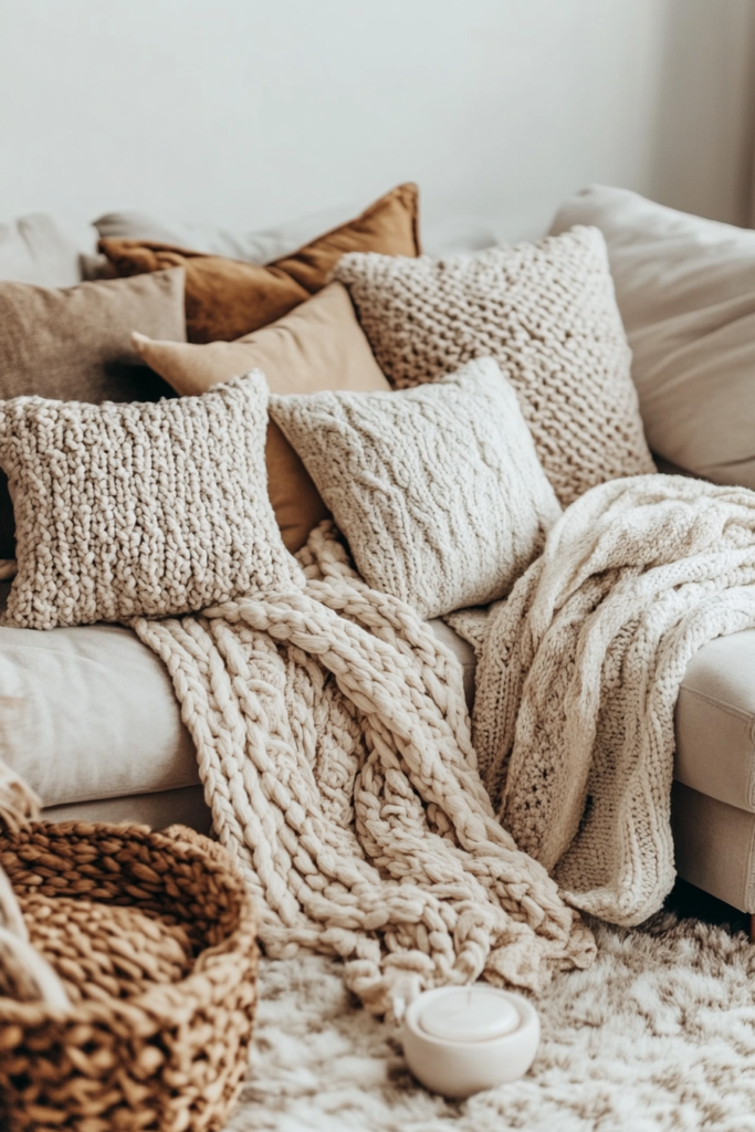 Throw blankets, textured pillows, and woven baskets create a perfect mix of softness and contrast. The key is to combine rough, smooth, and plush materials to enhance depth and warmth in your living area.