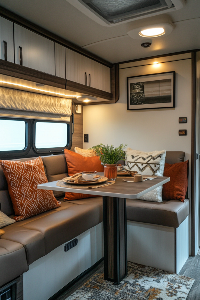Choosing the right color palette can significantly influence the feel of your RV’s interior. Light colors like white, cream, or soft pastels open up the area, making it feel bigger and airier. This choice is especially effective in smaller spaces typical of RV living.