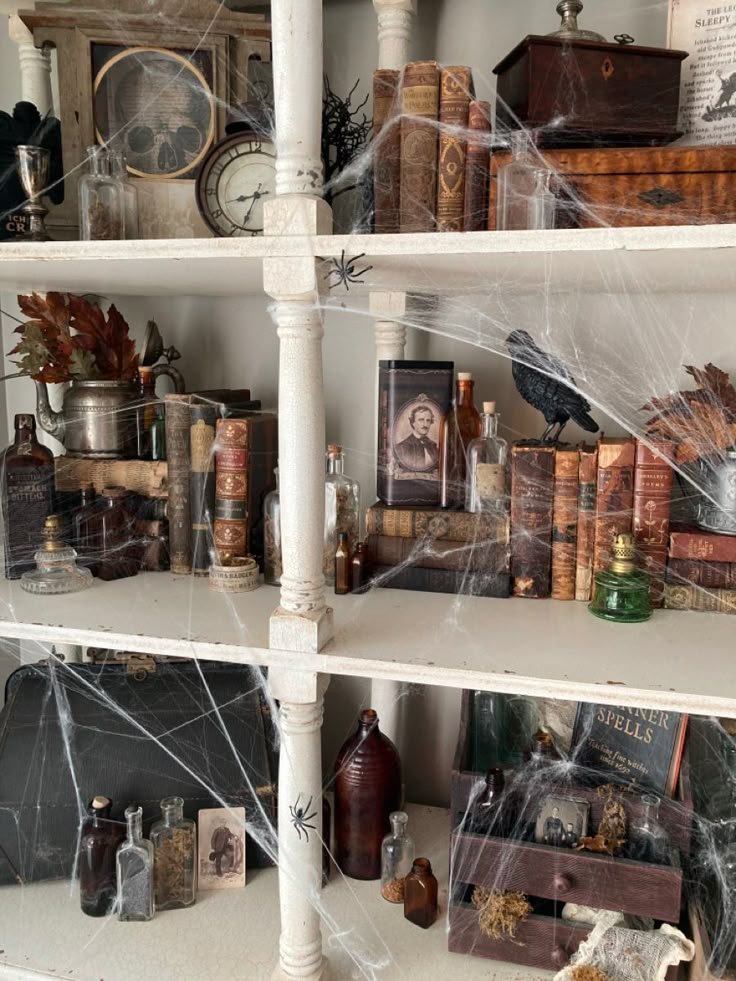 Drape faux cobwebs gently over shelves, letting them fall around book corners and candles. Add a plastic spider or two for effect, but keep it minimal and tasteful.