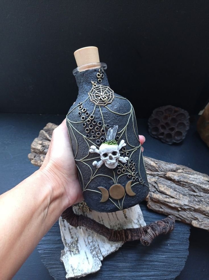Fill apothecary jars with faux bones, dried herbs, or black sand. Label them with aged paper and calligraphy: “Witch’s Salt,” “Mandrake Root,” or “Bat Wings.”