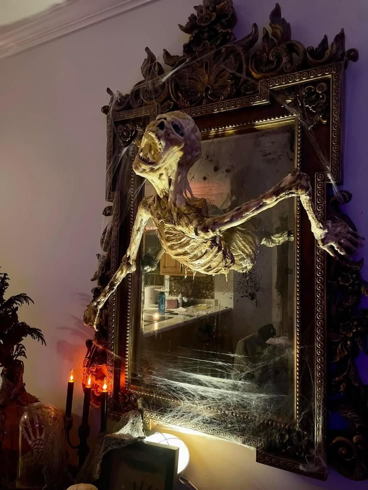 Build or buy a portable mantel and fill it with candles, skulls, or stacked books. Add an ornate mirror above to complete the vintage illusion.